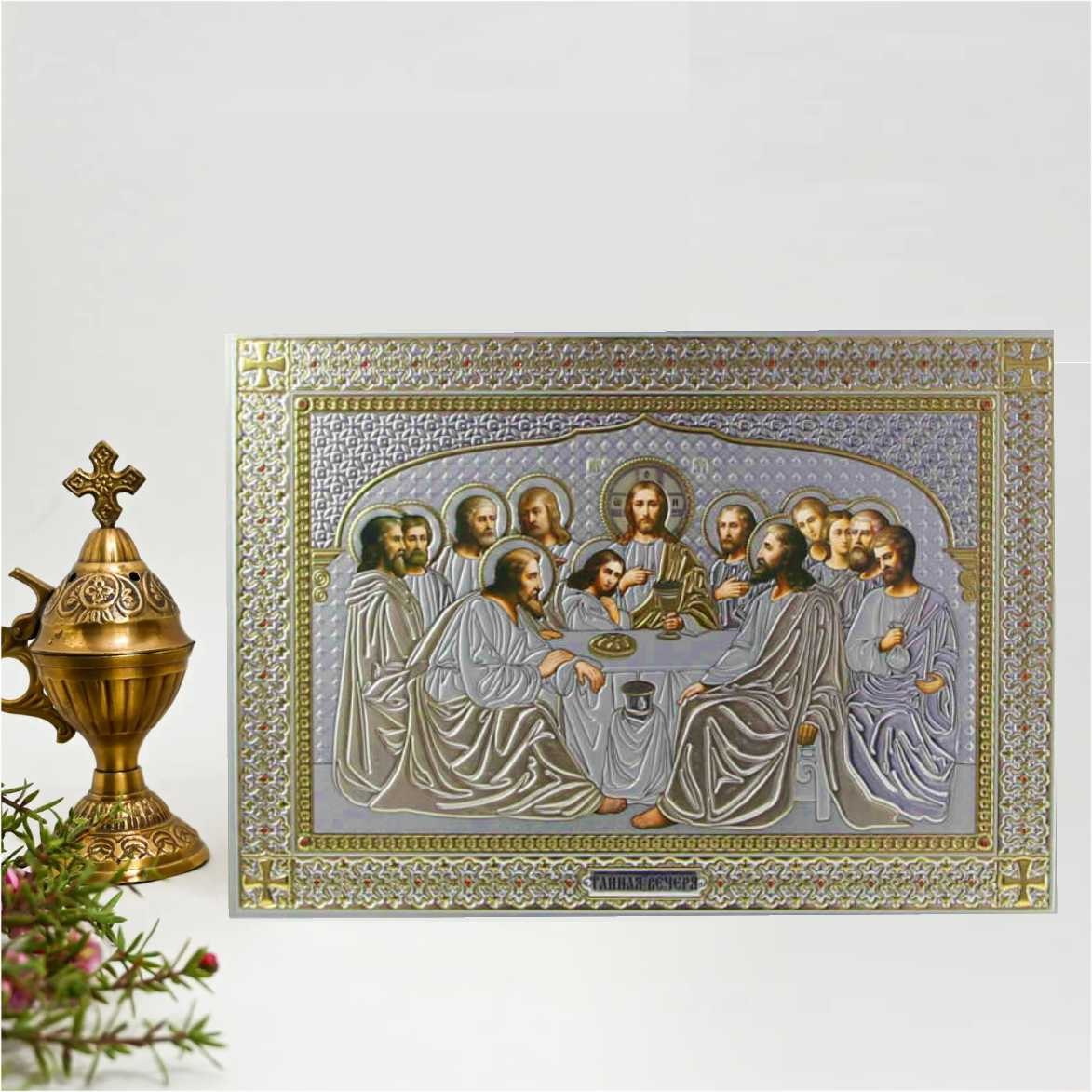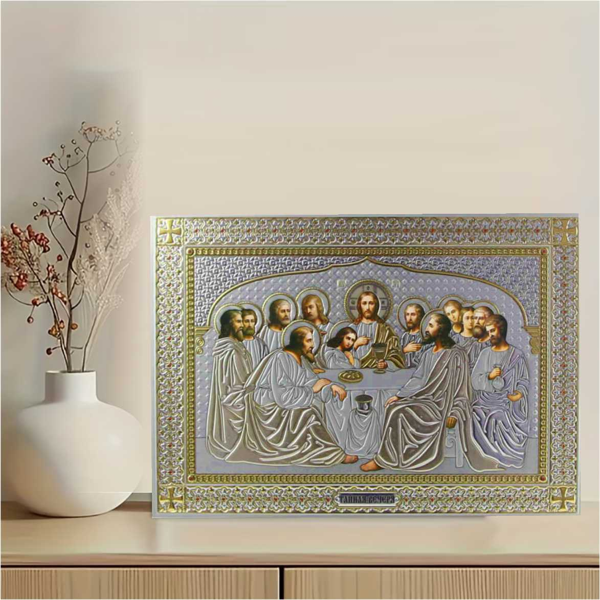 Această icoană este realizată pentru cei care doresc să aducă în locuință o prezență sfântă ce inspiră armonie și credință. Scena Cinei celei de Taină, în care Mântuitorul stă la masă împreună cu cei doisprezece apostoli, transmite liniște, înțelepciune și legătura profundă dintre oameni. Detaliile fine în relief și accentele luminoase oferă icoanei o eleganță aparte, potrivită pentru orice spațiu dedicat rugăciunii.